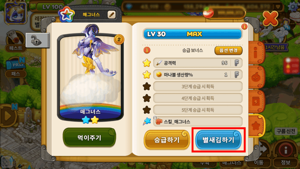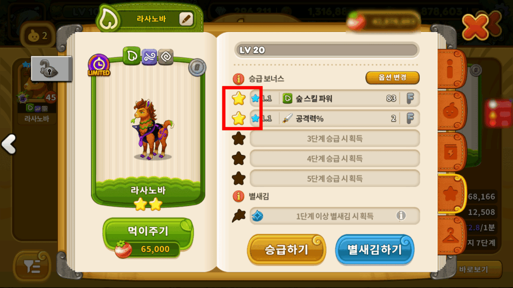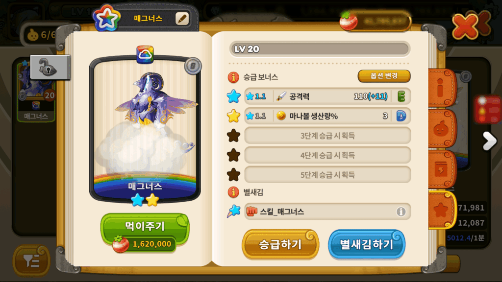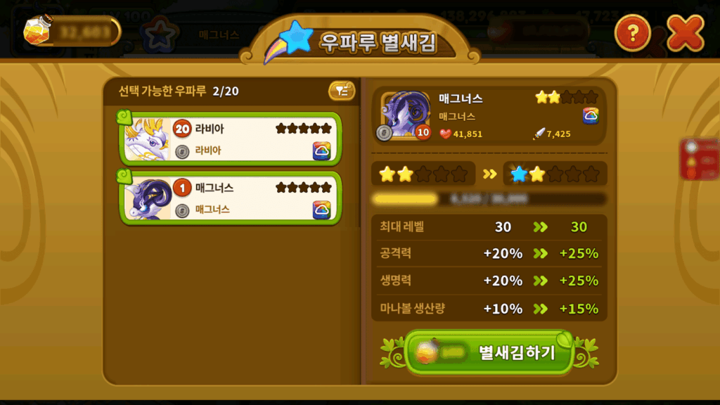 • 星刻印は、昇級過程で獲得した他のウパルを材料として使用できるように1つの属性でも重なる場合、材料として使用でます。