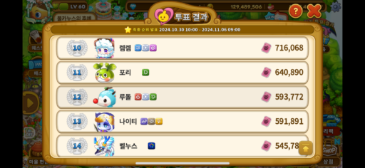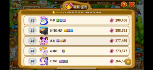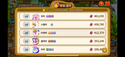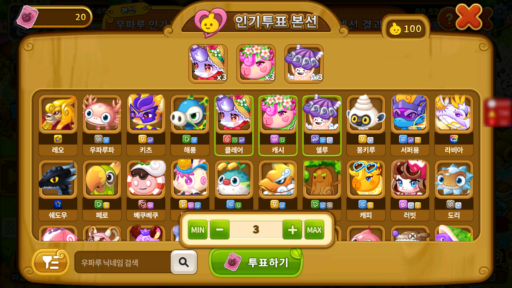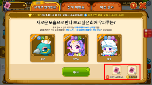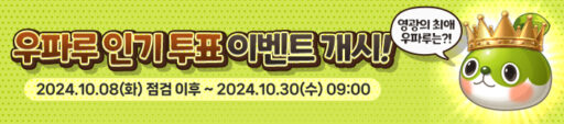 1周年記念ウパル人気投票イベントBy pinponpa-ru / 2026年3月22日 イベント案内 ホーム画面右上の「人気投票」ポップアップアイコンから入場できます。 後述するイベントルールで確認できる投票権獲得条件を満たしている場合は、赤いボックスをタップして交換することができます。 獲得した投票権は人気投票画面に入場し、ご希望のウパルを選択し投票することができます。同じウパルを対象に保有された投票権だけ重複投票が可能です。 イベント期間 予選(1週目) 10月08日(火)定期点検後~10月16日(水)09:00まで本線(2週目) 10月16日(水)定期点検後~10月23日(水)09:00まで決戦(3週目) 10月23日(水)定期点検後~10月30日(水)09:00まで結果発表(4週目) 10月30日(水)定期点検後~11月06日(水)09:00まで イベントルール 予選(1週目) 神聖進化、宝石進化、アトモスを除く現在までウパル村に訪れたウパルを対象に進行されます。予選では、イベントポップアップ内で投票券1枚あたり最大5種のウパルを選択できます。 投票権の取得方法 説明 ミッション獲得 ①クロス1回進行時に投票券10枚を獲得。 ②ミッションは毎日09:00に初期化されます。 召喚ポイント交換位 ①召喚時間20分あたり1点の召喚ポイントを獲得。 ※星属性を除く単一属性、アトモスは除外されます。 ②召喚ポイント30個を消費して投票券1枚を獲得。 本戦(2週目) 予選結果上位100匹のウパルを対象に進行されます。本選では、イベントポップアップ内で投票券1枚あたり最大3種のウパルを選択できます。 投票権の取得方法 説明 ミッション獲得 ①クロス1回進行時に投票券20枚を獲得。 ②ミッションは毎日09:00に初期化されます。 召喚ポイント交換位 ①召喚時間20分あたり1点の召喚ポイントを獲得。 ※星属性を除く単一属性、アトモスは除外されます。 ②召喚ポイント30個を消費して投票券1枚を獲得。 決戦(3週目) 本選結果上位20匹のウパルを対象に進行されます。決戦では、イベントポップアップ内で投票券1枚あたり最大1種のウパルを選択できます。 投票権の取得方法 説明 ミッション獲得 ①クロス1回進行時に投票券40枚を獲得。 ②ミッションは毎日09:00に初期化されます。 召喚ポイント交換位 ①召喚時間20分あたり1点の召喚ポイントを獲得。 ※星属性を除く単一属性、アトモスは除外されます。 ②召喚ポイント30個を消費して投票券1枚を獲得。 結果発表(4週目) 決戦結果上位20匹のウパルの順位と得票数が発表されます。上位3種のウパルは新規ウパルで製作されます。 イベント参加報酬 個人報酬 達成条件 報酬 20回投票 レベル別宝石30個に相当するマナボール 50回投票 レベル別宝石40個に相当する餌 80回投票 タイムカプセル50個 ※ 予選、本選、決戦周期で報酬獲得条件が初期化されます。 ミッション報酬 達成条件 報酬 総累積投票 1,000,000回 2属性一般ウパルオプション1個 総累積投票 2,500,000回 3属性一般ウパルオプション1個 イベント特別特典 上位3種新規ウパルで製作1位ウパル:新規ウパルで製作、スキン製作2位ウパル:新規ウパルで製作3位ウパル:新規ウパルで製作上位3種新規ウパル追加時点で収集イベント進行新規で追加される上位3種をテーマにした舞台製作3種すべて収集時に「舞台」を獲得できる収集イベントユーザーのための特別オプション上位3種追加時点で投票に参加されたすべてのユーザー様を対象にTOP3ウパル選択券1枚支給※ 新しく製作された上位3種のうち1匹のウパルを選択できる特典です。 注意事項 ※ 1~3位を達成したウパルではなく、該当の見た目をベースに新規ウパルで製作され、追加されます。※ 新規ウパルで製作されるだけで、詳細、属性が変更されることがあります。※ ミッション獲得投票券はミッション達成後、イベントポップアップ内でタップすることで獲得が可能です。※ ミッション達成後、ミッション獲得投票権を受け取らなかった場合、1日の初期化時に消滅し、復旧できません。※ イベント参加報酬は獲得条件達成時にイベントポップアップ内でタップすることで獲得が可能です。※ 受け取っていないイベント参加報酬は、次のイベントが始まるとプレゼントボックスに自動的に支払われます。※ プレゼントで支給されたイベント参加報酬の保管期間が満了した場合、復旧はできません。※ 獲得した投票券は予選、本選、決戦で使用可能です。※ 獲得した投票券を決戦まで使用しなかった場合、今後のイベント等で使用できません。 結果発表 多くのユーザーが投票した人気投票ウパルの追加日程についてご案内いたします。サーファー、スカル、ラビット上位3匹のウパルのデザインは12月中に完成予定、完成次第シルエットを公開します。 第1位 サーファー 多くの得票数と共にユーザー様がユニークなキャラクター性まで評価していただき、人気の多いウパルであることが確認できました。多くのユーザー様が好きなポイントが維持できるように準備しています。 第2位 スカル ウパルルオデッセイで昨年披露したハロウィンコンセプトの限定ウパル